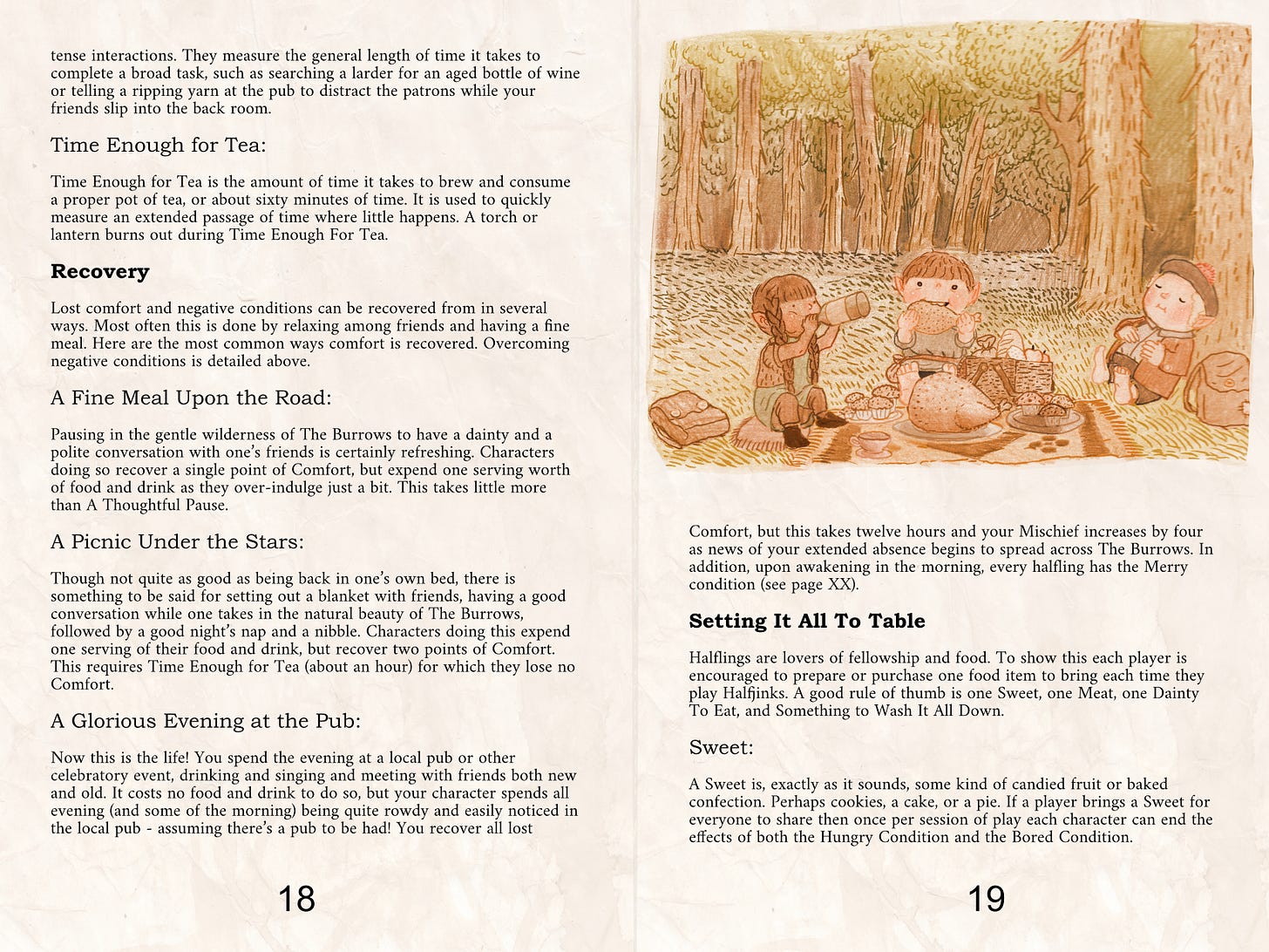 Food, as is appropriate to any gaming involving halflings, plays a huge role. Characters who don’t eat regularly become Hungry and all dice rolls become more difficult. Food (and other gear) takes up Inventory Slots and as you fill your Inventory Slots your maximum Comfort is diminished because you’re carrying too much stuff!